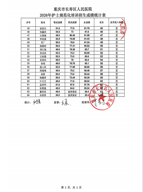 重庆市长寿区人民医院 2026年护士规范化培训招收成绩公示